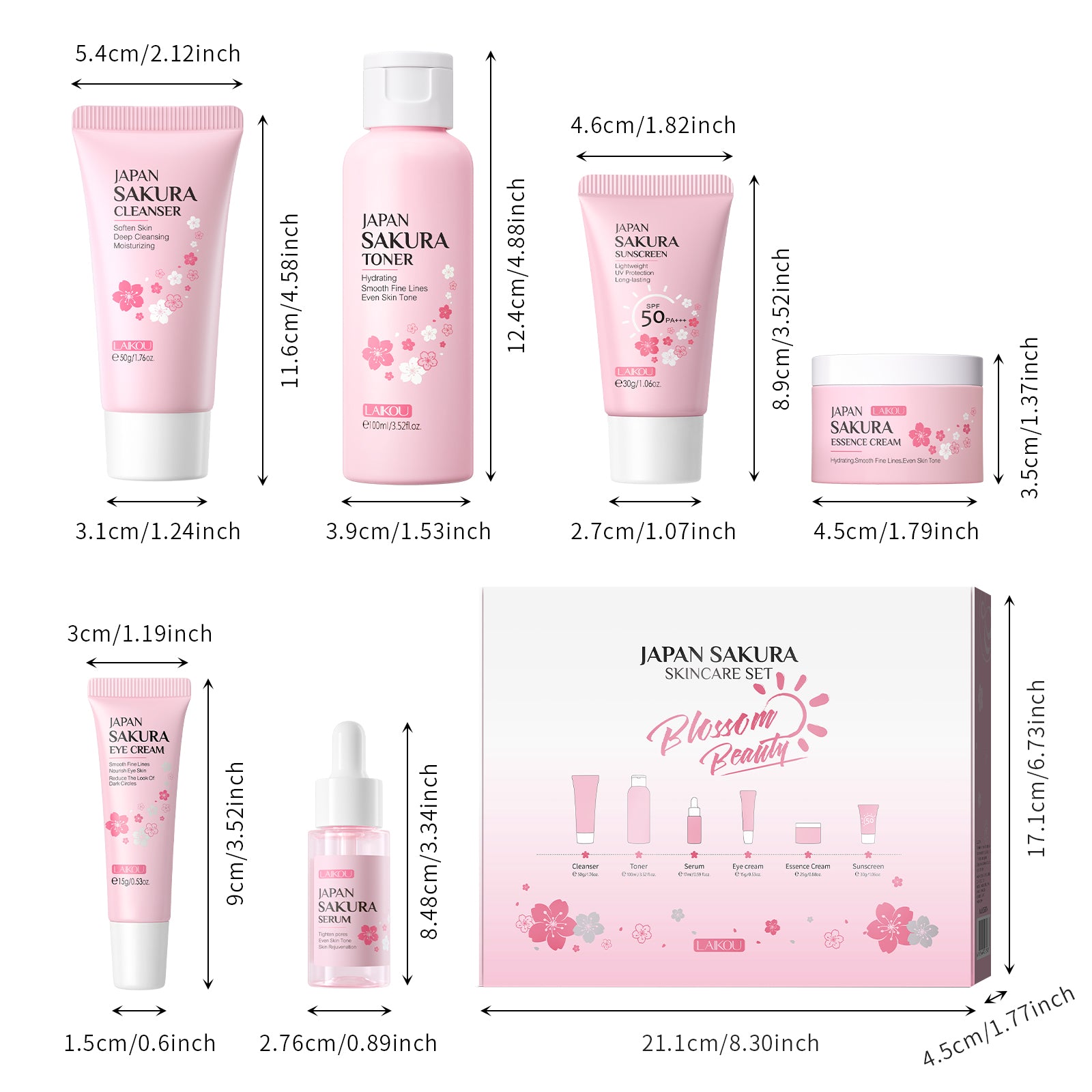 The LAIKOU JAPAN SAKURA SKINCARE SET is formulated with key ingredients likeNiacinamide, Prunus Lannesiana Flower Extract, and Sodium Hyaluronate, offering nourishing, moisturizing, and whitening effects. Suitable for all skin types, this 6-piece facial set is designed for home use and targets anti-wrinkle care while enhancing skin tone brightness. Customized logo options are available, making it ideal for personalized branding needs.